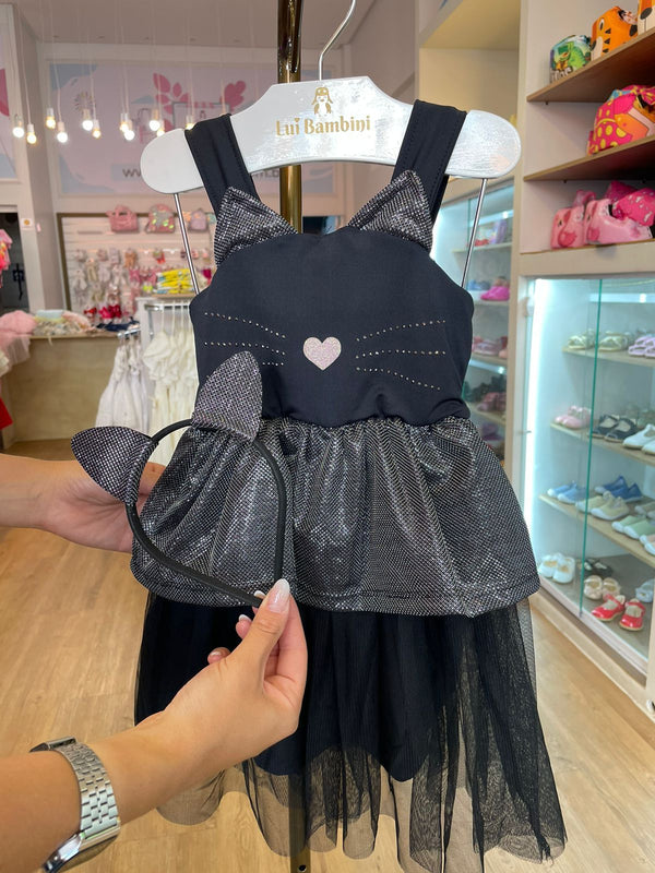 FANTASIA VESTIDO ALÇA GATINHA COM STRASS E TIARA ORELHINHA MENINA INFANTI