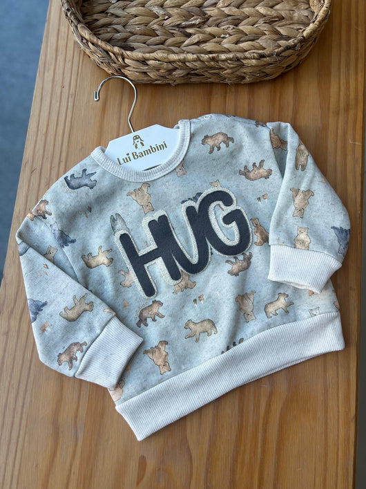 BLUSÃO EM MOLETINHO MANGA LONGA ESTAMPA URSOS E ESCRITA "HUG"