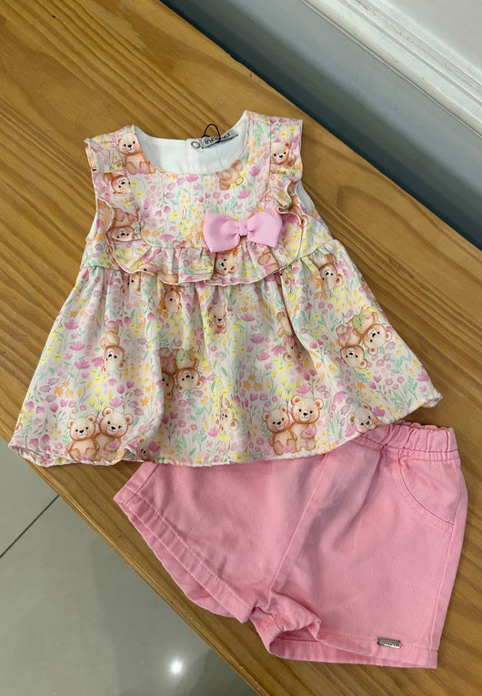 CONJUNTO BATA REGATA COM BABADO LAÇO URSINHOS E FLORES COM SHORT MENINA INFANTI