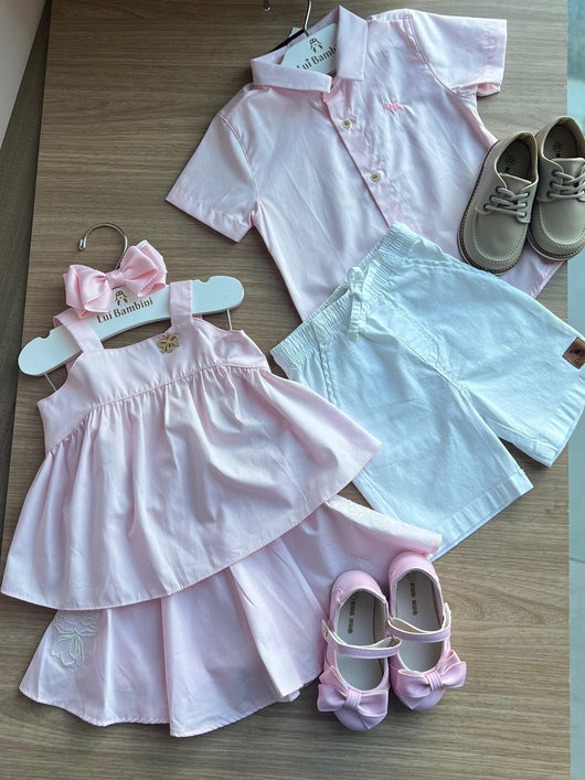 CONJUNTO BLUSA ALÇA PINGENTE DOURADO E SAIA FLOR BORDADA TRICOLINE MENINA CHARPEY