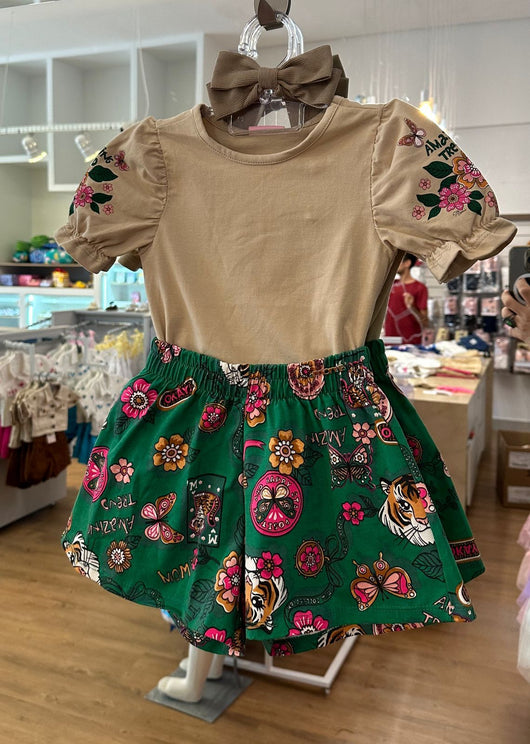 CONJUNTO BLUSA MANGA CURTA BUFANTE COM SHORT ONCINHA FLORAL TREND MENINA MOMI