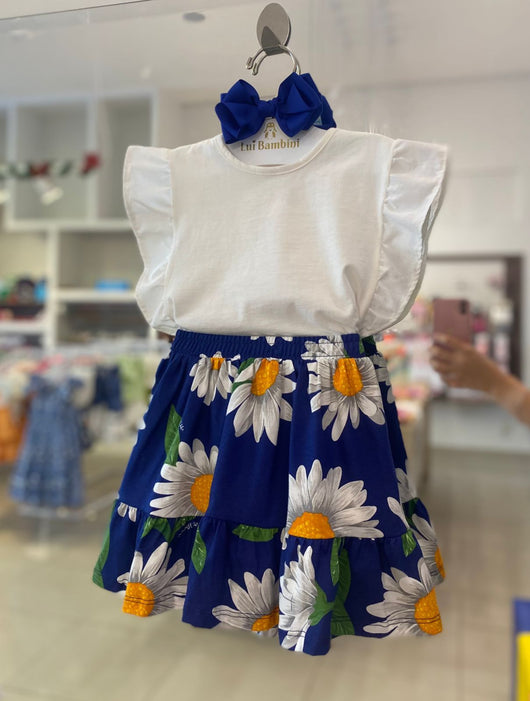 CONJUNTO BLUSA MANGA CURTA EVASÊ COM BABADOS E SAIA FLORAL DE MARGARIDAS