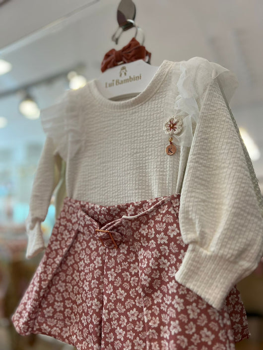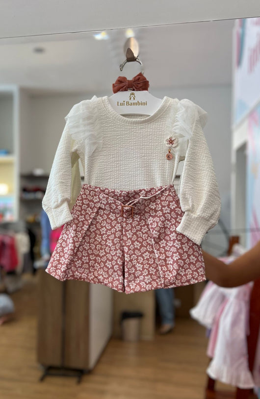 CONJUNTO BLUSA MANGA LONGA E SOBREPOSIÇÃO COM TULE BORDADO E PÉROLA COM SHORT FLORAL E FIVELA MENINA KIKI XODO