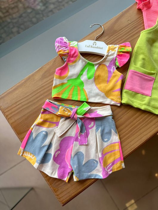 CONJUNTO BLUSA REGATA ALÇA COM SHORT CINTO FIXO FLORES AQUARELA MENINA FAKINI