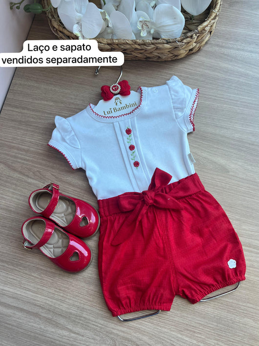 CONJUNTO BODY MANGA CURTA BABADO FLORES BORDADAS SHORT MAQUINETADO CINTO LAÇO MENINA ANJOS BABY