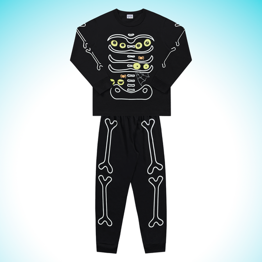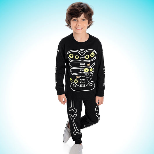 CAMISETA MANGA LONGA EM MEIA MALHA, COM ELÁSTICO NOS PUNHOS E ESTAMPA DE ESQUELETO E MONSTRINHOS QUE BRILHAM NO ESCURO