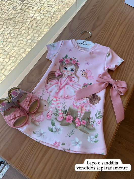 VESTIDO MANGA CURTA FESTA NO JARDIM LOVE COM PÉROLAS MENINA KUKIE