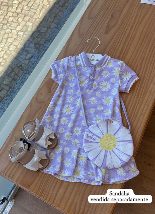 VESTIDO MANGA CURTA GOLA BABADOS EM RIBANA E BOLSA FLORAL COM STRASS MENINA KUKIE