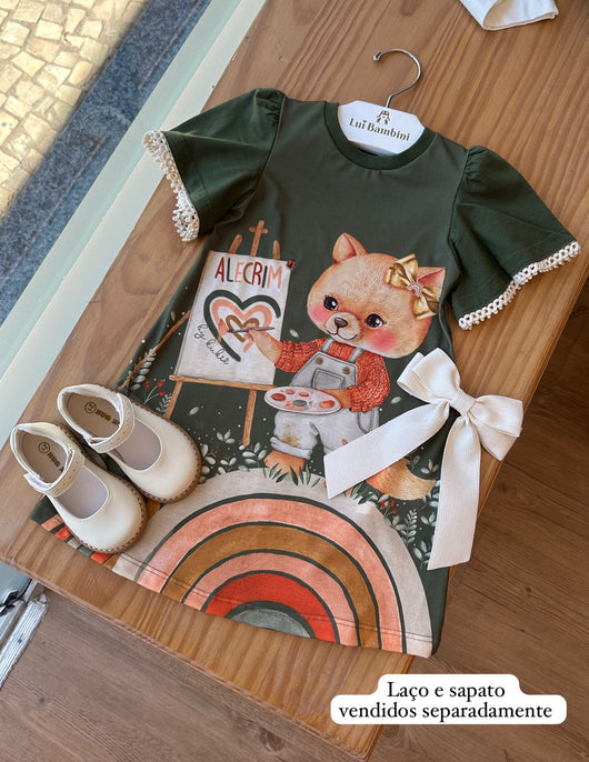 VESTIDO MANGA CURTA TRICÔ HORA DE PINTAR URSINHA E FOLHAS MENINA KUKIÊ