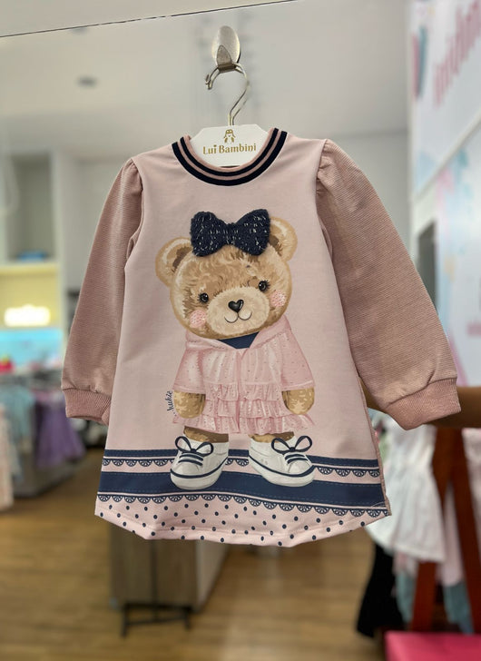VESTIDO MANGA LONGA EM MALHA LUREX E MOLETINHO, COM ESTAMPA DE URSINHA E LAÇO PELUCIADO E APLICAÇÃO EM STRASS